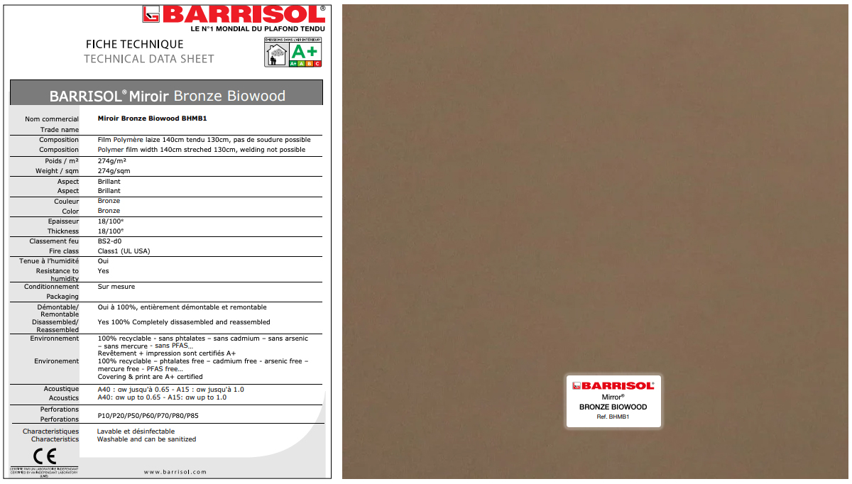 Представяме новото платно на Barrisol - Biowood Bronze Mirror, елегантен завършек с изтънчен бронзов огледален ефект.