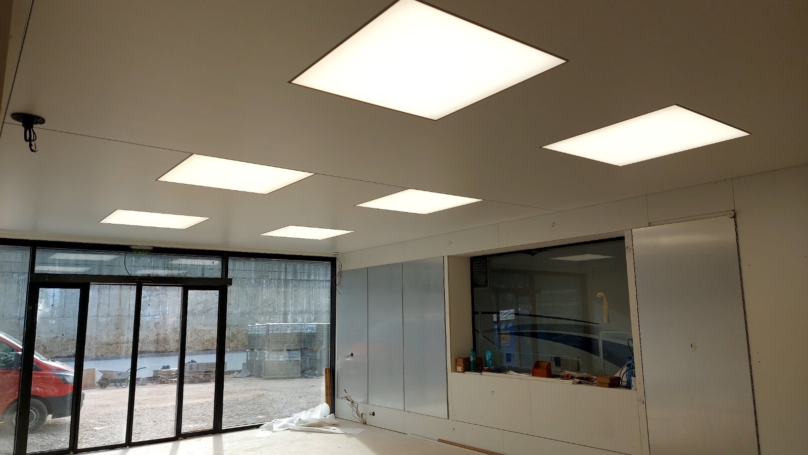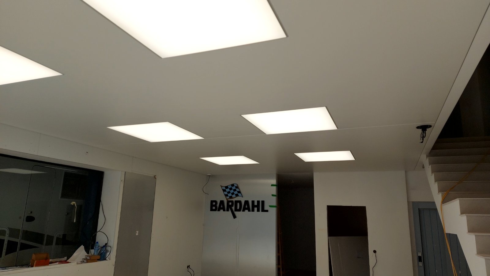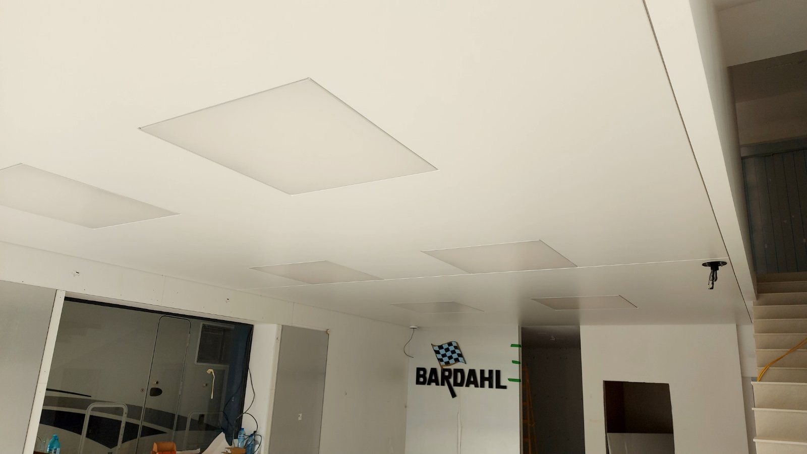 При един от последно завършените ни обекти, монтирахме като основен таван бели матови платна Барисол, а спрямо бъдещето разположение на работните места в помещението, изработихме вградени осветителни тела от транслуцентни/светещи платна Барисол.
